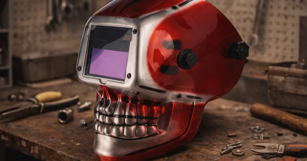 Automaattinen hitsausmaski, jonka ulkoasua hallitsee pääkallokuviointi, on suunniteltu tarjoamaan yhdellä kertaa suojaa, toimivuutta ja kohtuullista käyttömukavuutta. Maski suojaa käyttäjän kasvoja ja silmiä hitsauskipinöiltä sekä valokaaresta syntyvältä haitalliselta säteilyltä, mikä on välttämätöntä sekä lyhyissä että pidemmissä työrupeamissa. Ulkonäkö on tässä mallissa tavanomaista näyttävämpi, mutta perusajatus pysyy samana kuin muissakin hitsauskypärissä eli suojaus ja käytännöllisyys hitsaustyön aikana.